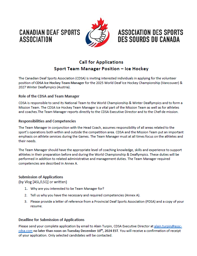 The Canadian Deaf Sports Association (CDSA) is inviting interested individuals in applying for the volunteer position of CDSA Ice Hockey Team Manager for the 2025 World Deaf Ice Hockey Championship (Vancouver) & 2027 Winter Deaflympics (Austria).