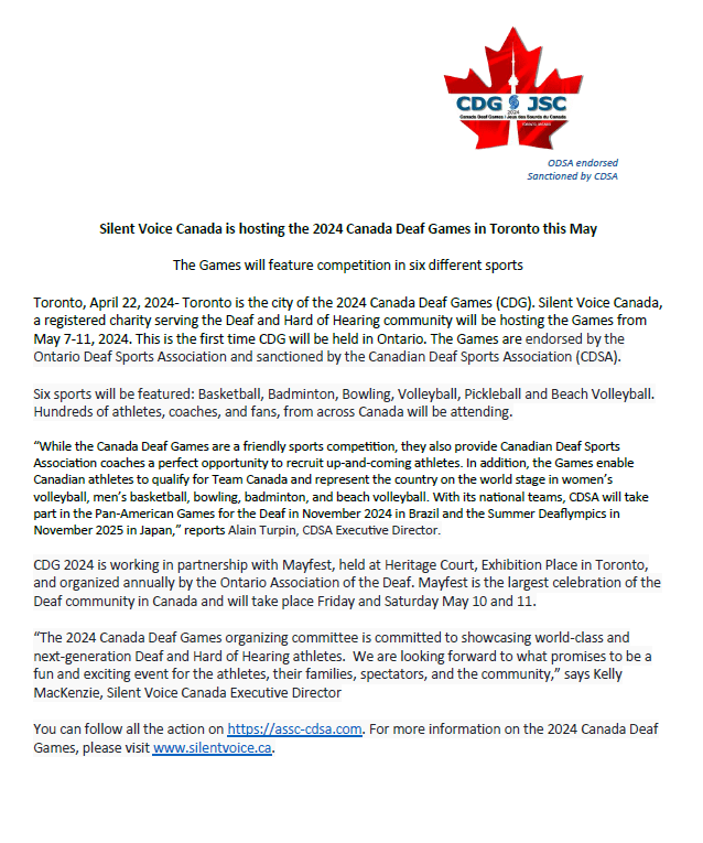 Toronto is the city of the 2024 Canada Deaf Games (CDG). Silent Voice Canada, a registered charity serving the Deaf and Hard of Hearing community will be hosting the Games from May 7-11, 2024. This is the first time CDG will be held in Ontario. The Games are endorsed by the Ontario Deaf Sports Association and sanctioned by the Canadian Deaf Sports Association (CDSA).