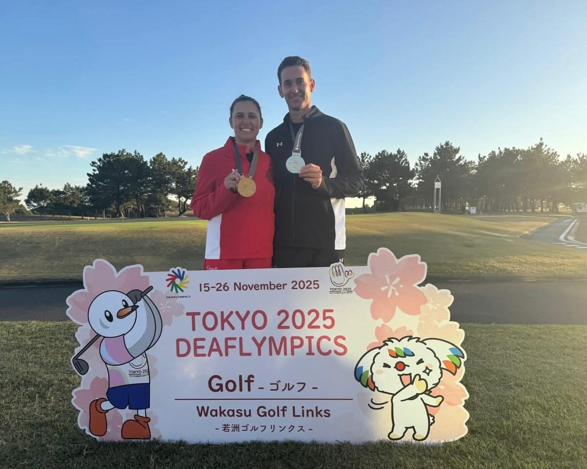 Erica Rivard (Ontario) finishes third and wins the bronze medal in Women’s Golf. | Erica Rivard (Ontario) and Russell Bowie (Ontario) winning the gold medal in Golf Mixed Team at the 2025 Deaflympics in Japan. |