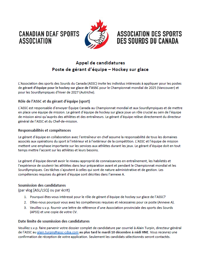 L’Association des sports des Sourds du Canada (ASSC) invite les individus intéressés à appliquer pour les postes de gérant d’équipe pour le hockey sur glace de l’ASSC pour le Championnat mondial de 2025 (Vancouver) et pour les Sourdlympiques d’hiver de 2027 (Autriche).