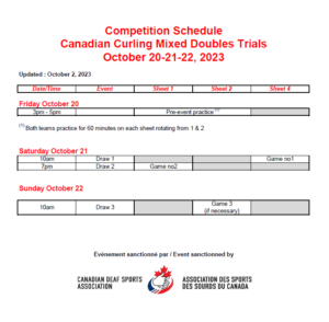 Mise à jour: L’événement de juin 2023 est annulé pour insuffisance du nombre d’équipes inscrites. Cependant, il y aura une compétition entre 2 équipes (MB et ON) du 20 au 22 octobre 2023 à Boucherville (Qc). Ceci déterminera l’équipe qui représentera Équipe Canada aux Sourdlympiques d’hiver en Turquie en février 2024.