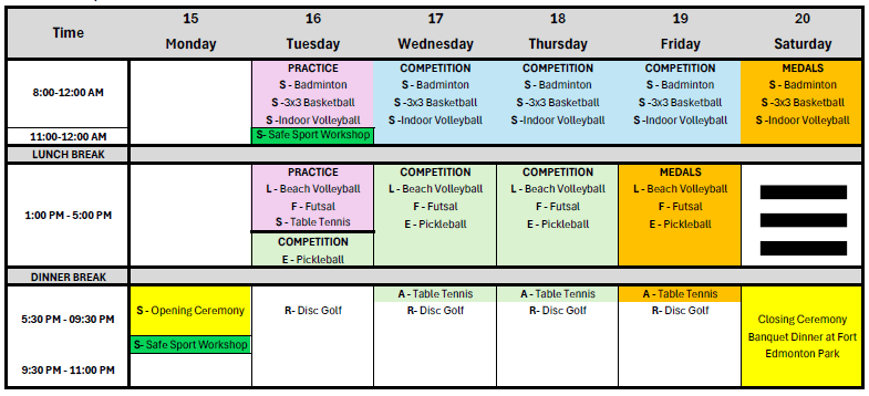 Badminton / Basketball 3×3 / Volleyball intérieur / Volleyball de plage / Futsal / Tennis de table / Pickleball (*) / Disc golf (*)