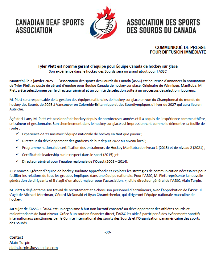 Montréal, le 2 janvier 2025 —L’Association des sports des Sourds du Canada (ASSC) est heureuse d’annoncer la nomination de Tyler Plett au poste de gérant d’équipe pour Équipe Canada de hockey sur glace. Originaire de Winnipeg, Manitoba, M. Plett a été sélectionnée par le directeur général et un comité de sélection suite à un processus de sélection rigoureux.